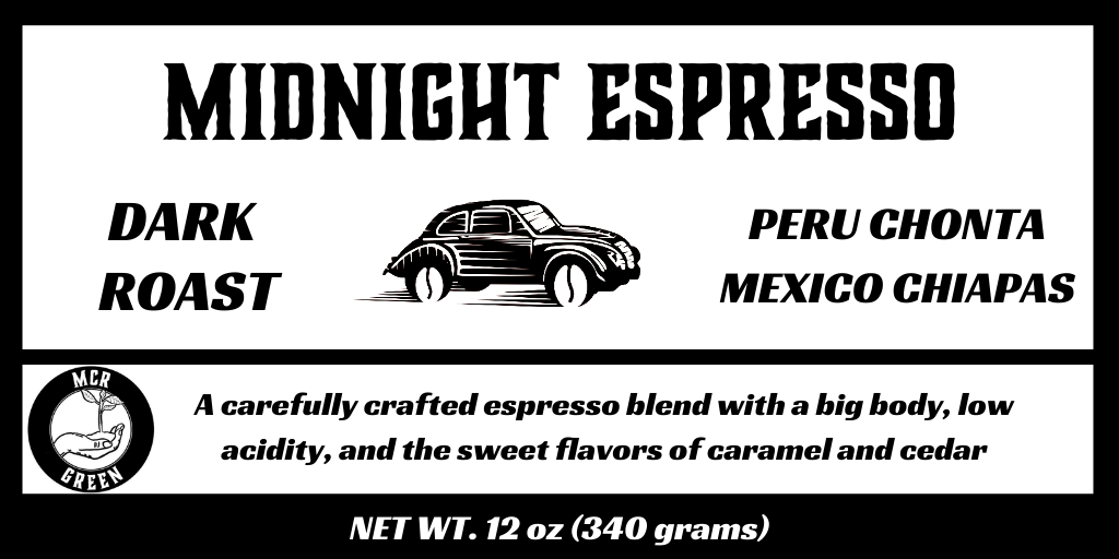 Midnight Espresso Blend is part of our MCR Green program. MCR Green is about doing what we can to support an infrastructure that brings both profit and prosperity to the coffee producers, in addition to supporting high quality and organically grown coffee. All of our coffee is sourced from the Genuine Origin Coffee Project, but MCR Green coffees also carry the distinction of being certified organically grown.